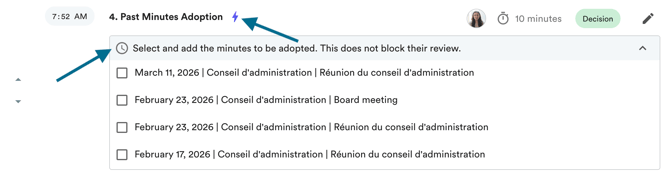 The "Past Minutes Adoption" smart topic is added by default to the agenda when you create a meeting. Panorama automatically shows all minutes pending adoption.