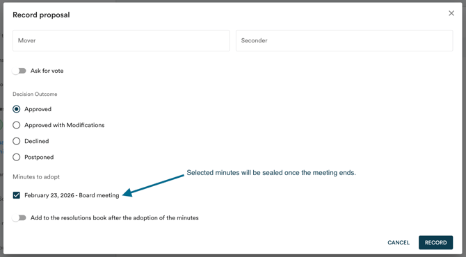 During the meeting, record the adoption motion to seal the selected minutes. Learn more about taking notes at a meeting →