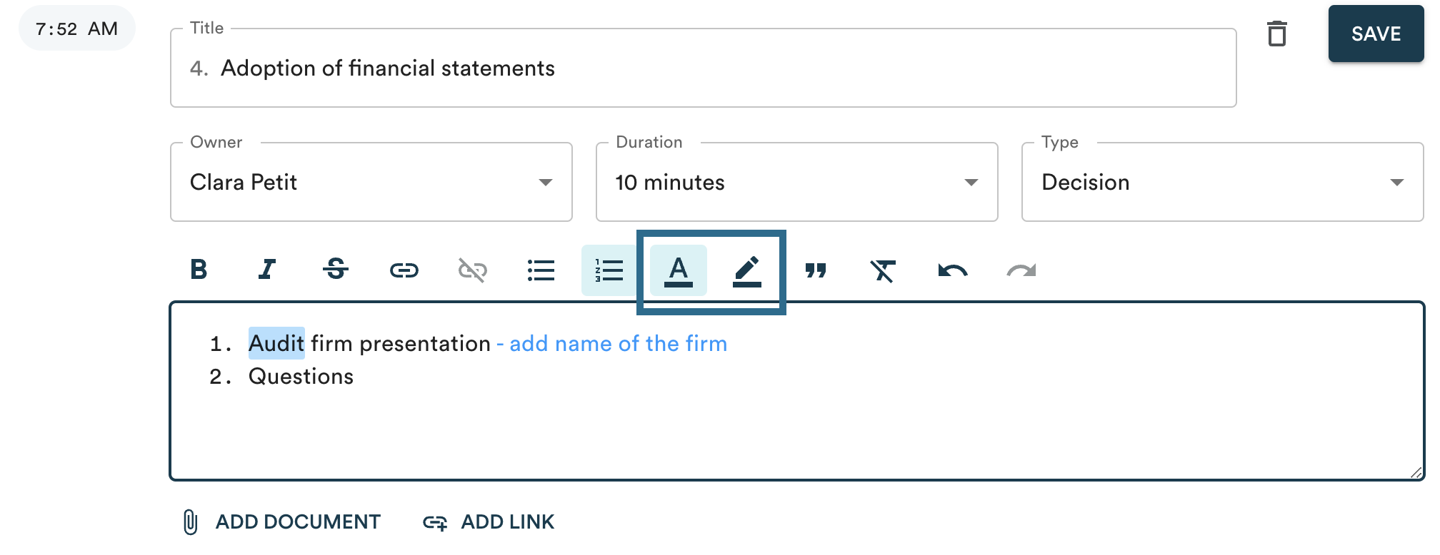 In the Panorama text editor - whether for an agenda, minutes or written resolution - you can change the color of the text and highlight it.