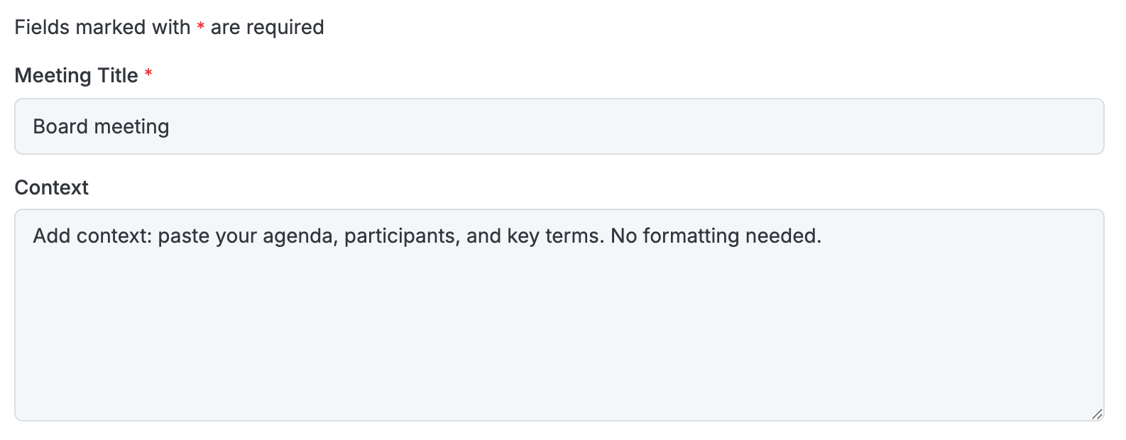 This text field is where you provide any relevant information. No formatting is required: even if the text you paste is imperfect or hard to read, MinutesIQ will know how to interpret it.