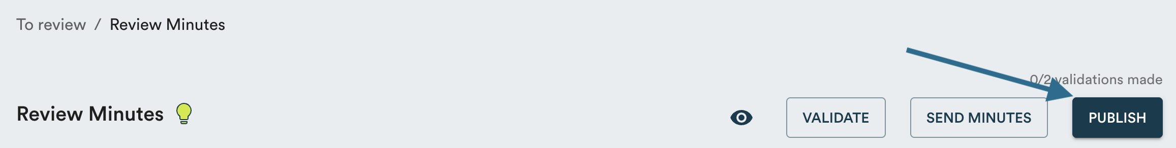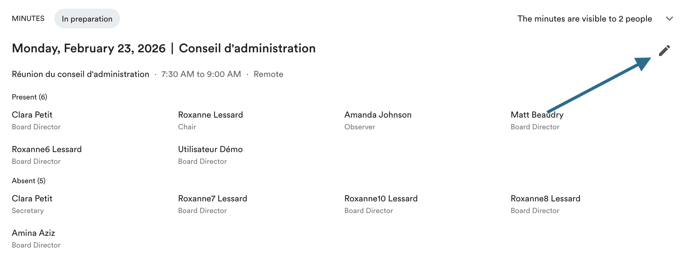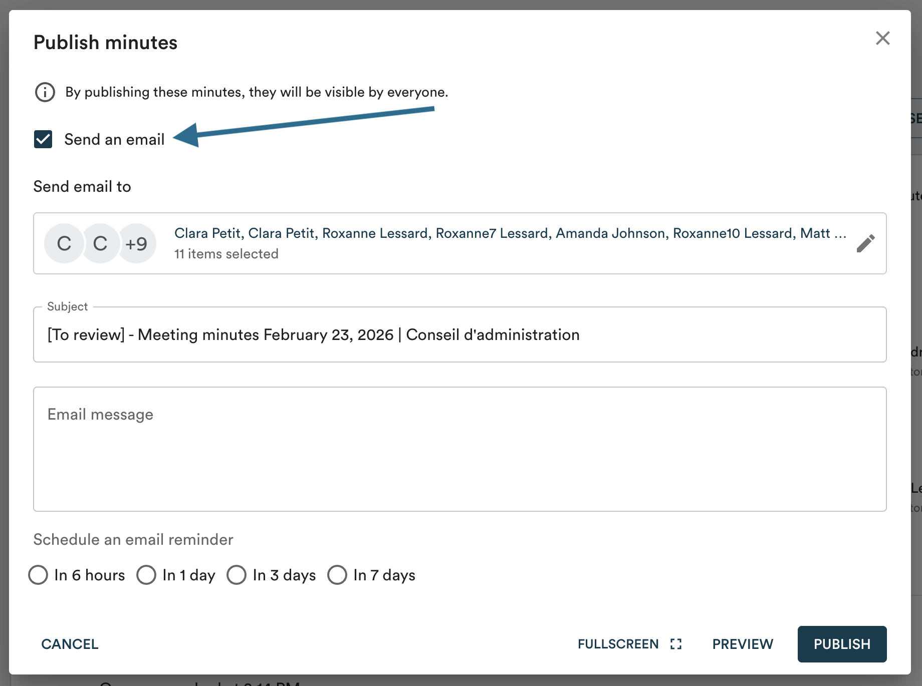 For all members of your board to be able to consult the minutes, click "Publish" at the top of the page. This allows you, optionally, to send an email to meeting participants to notify them that they can consult the minutes.