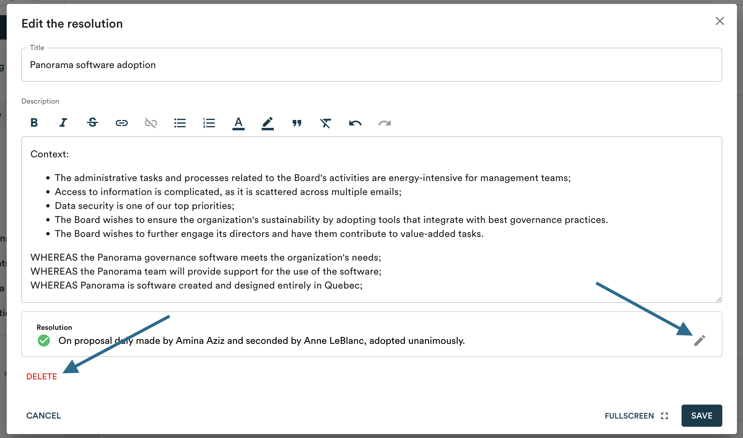If you adopted a resolution in the meeting, you can always make changes to it during minutes review. You can edit the title and text of the resolution, the mover and seconder, as well as the vote result.