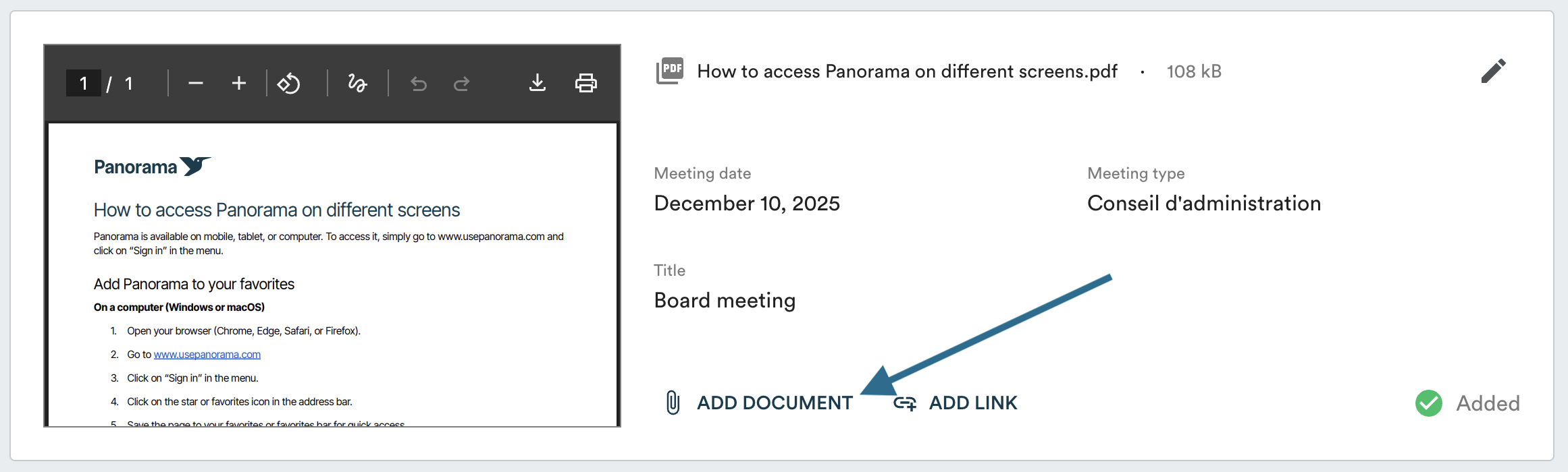Panorama allows you to import your past minutes, resolutions and agendas directly under the corresponding tabs ("Minutes", "Resolutions" and "Meetings"), and to add your reference documents to your document centre. Importing minutes, resolutions and agendas is reserved for account owners. Access to the document centre depends on the permissions configured for each member.