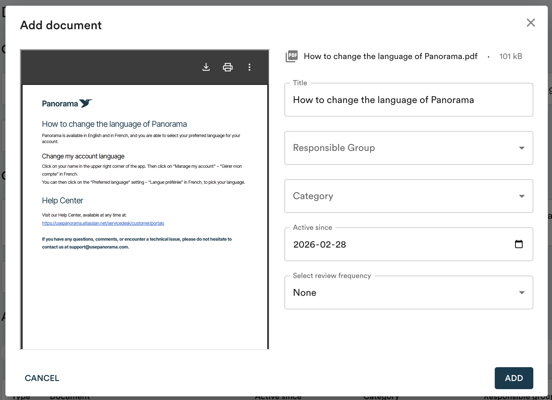 - Review frequency: (optional) Panorama will display a visual reminder when it is time to review the document. This frequency is calculated from the "Active since" date, or you can set a specific date using the "Custom" option. Panorama does not send email reminders for this.