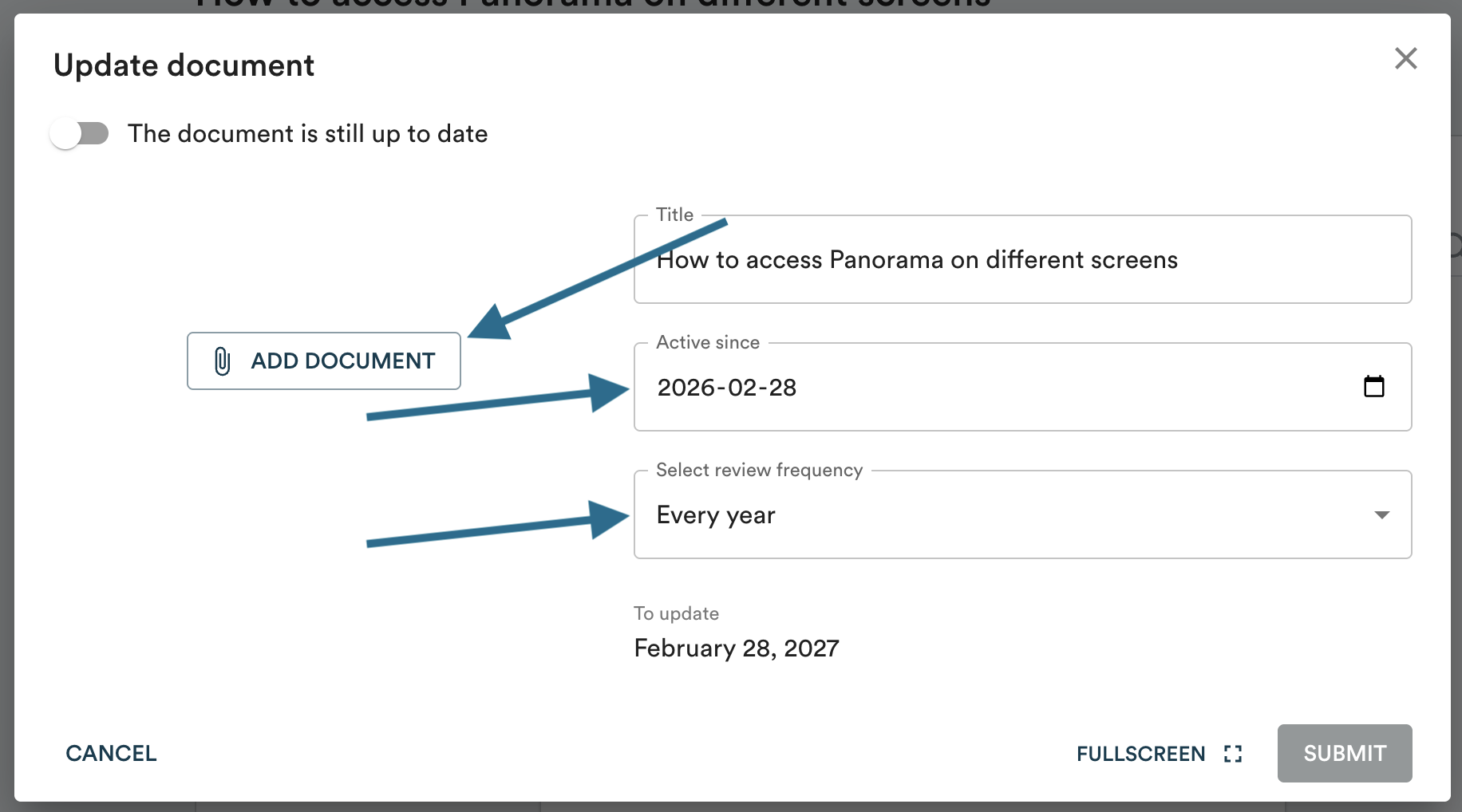 Add the new file, enter the date from which this version is in effect, and adjust the review frequency as needed. By clicking "Submit", the document is updated and the previous version is automatically saved in the "History" section at the bottom of the page.