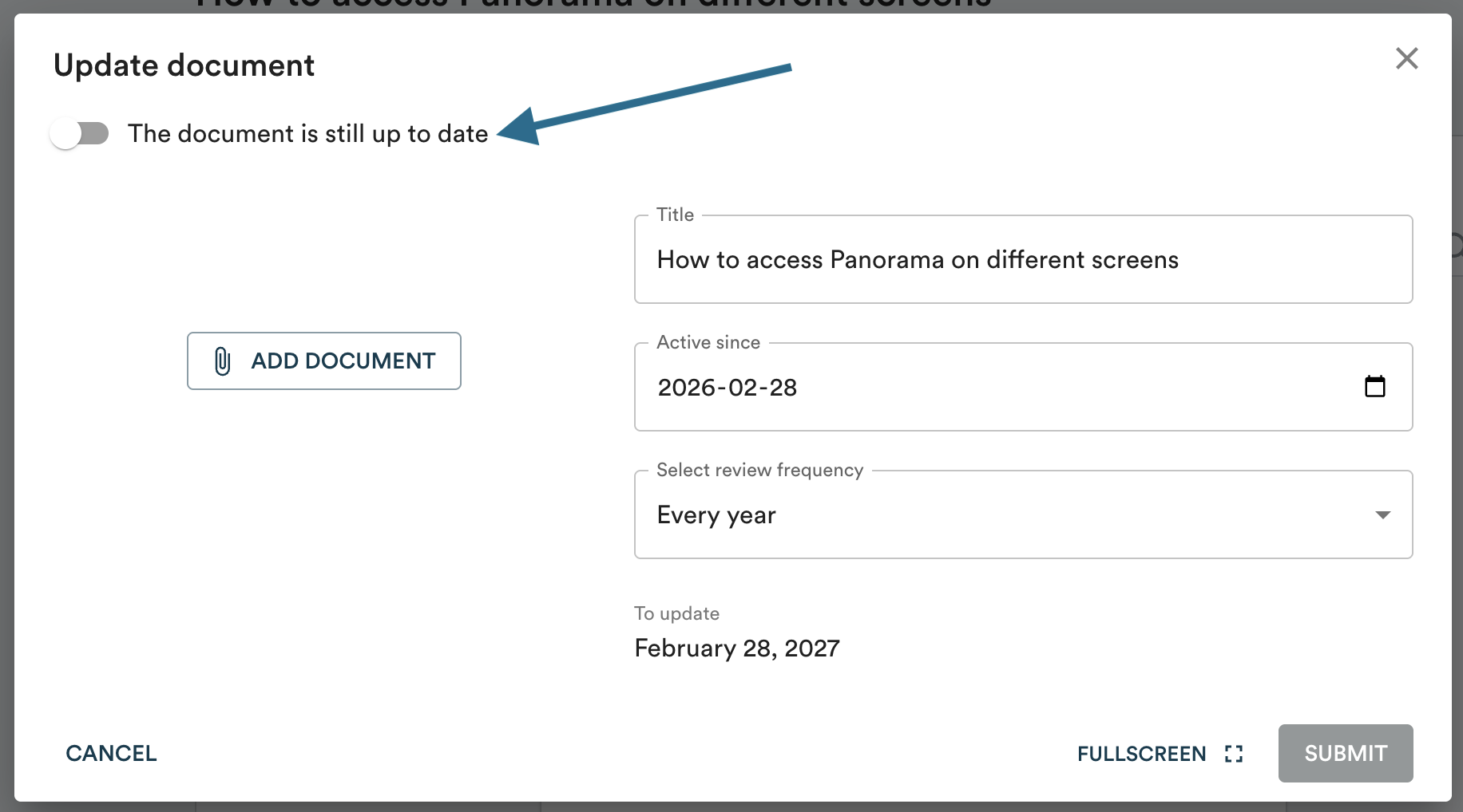 Once a new version of a document has been approved, you can update it directly in Panorama.
