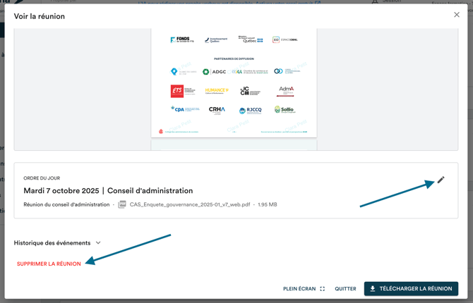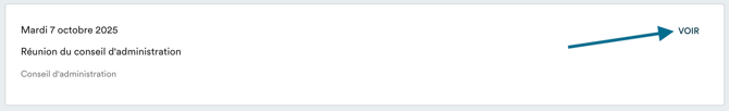 Une fois ajoutés, ces documents restent modifiables. Cliquez sur le crayon en haut à droite de la carte pour modifier la date, le type de réunion ou les documents attachés. En ouvrant un document depuis votre registre, vous pouvez également le consulter (si c'est un PDF), modifier ses données ou le supprimer en cas d'erreur.