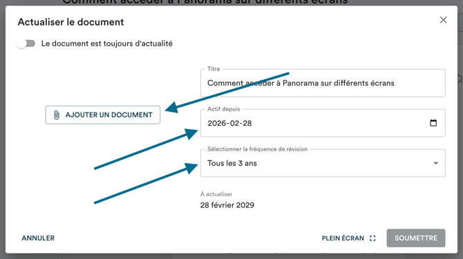 Ajoutez le nouveau fichier, indiquez la date depuis laquelle cette version est en vigueur et ajustez la fréquence de révision au besoin. En cliquant sur "Soumettre", le document est actualisé et l'ancienne version est automatiquement conservée dans la section "Historique" en bas de page.
