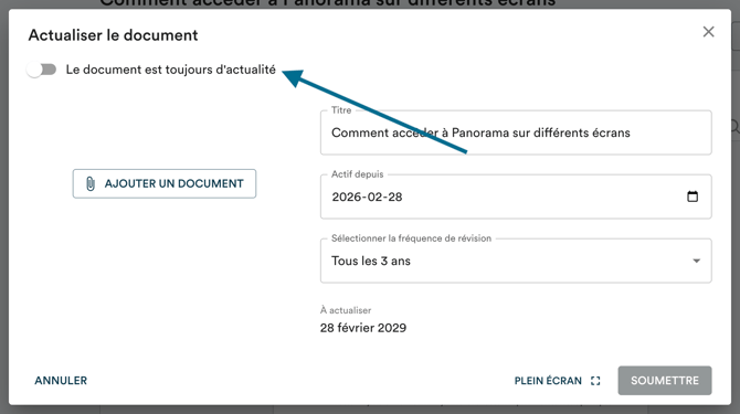 Si le document n'a pas changé mais que vous souhaitez repousser la date de révision, cliquez sur "Actualiser" puis sélectionnez "Le document est toujours d'actualité".